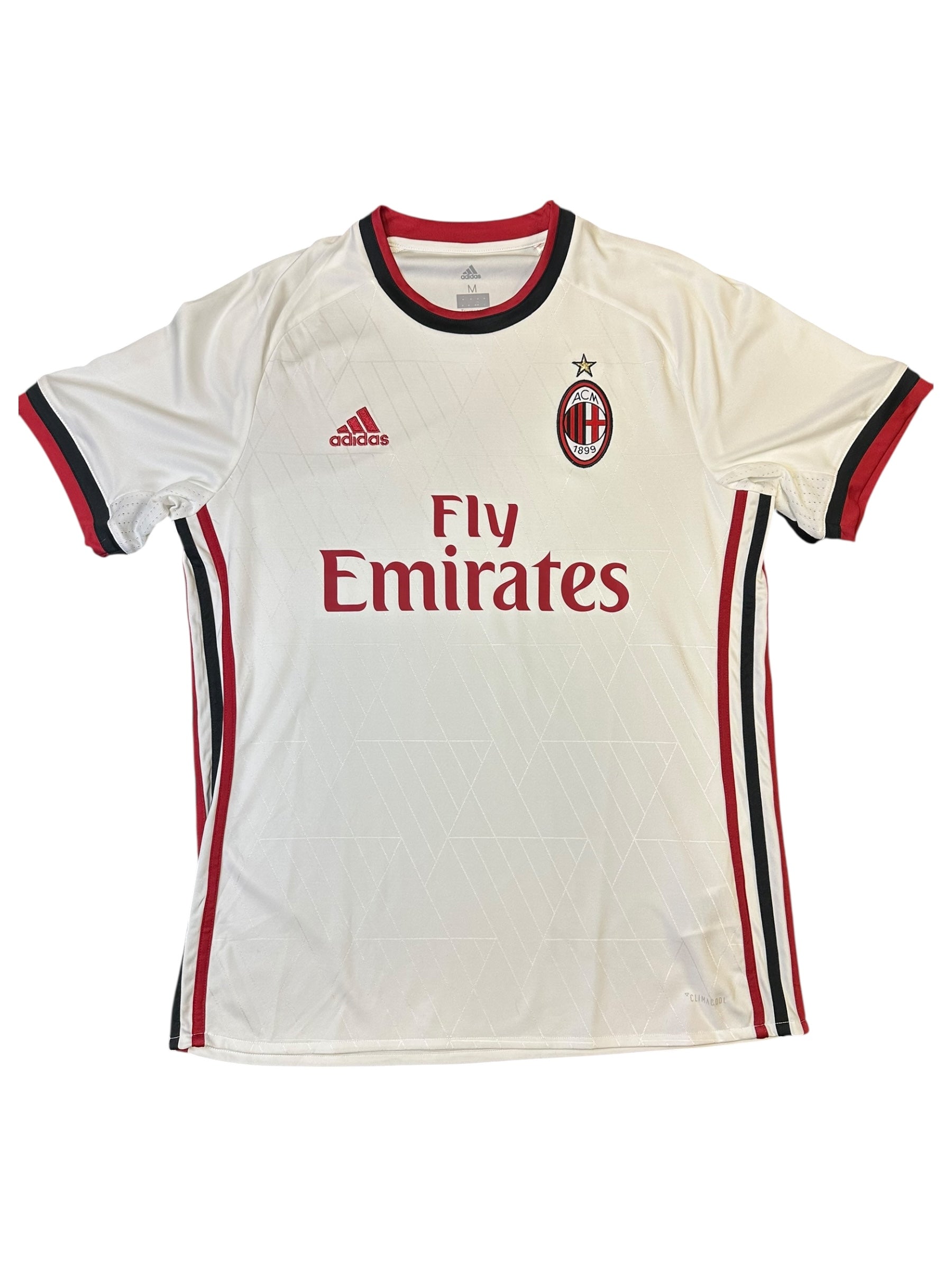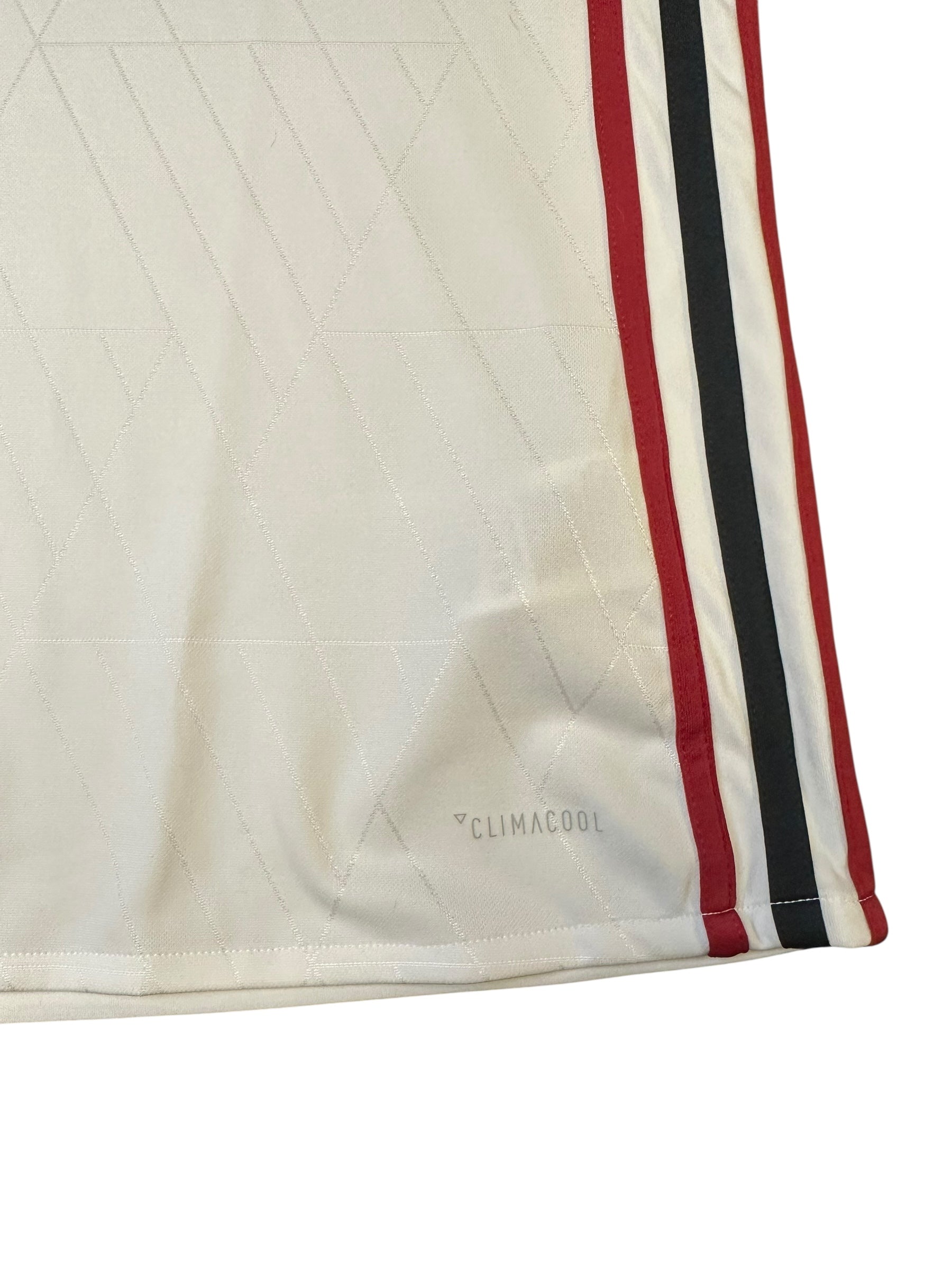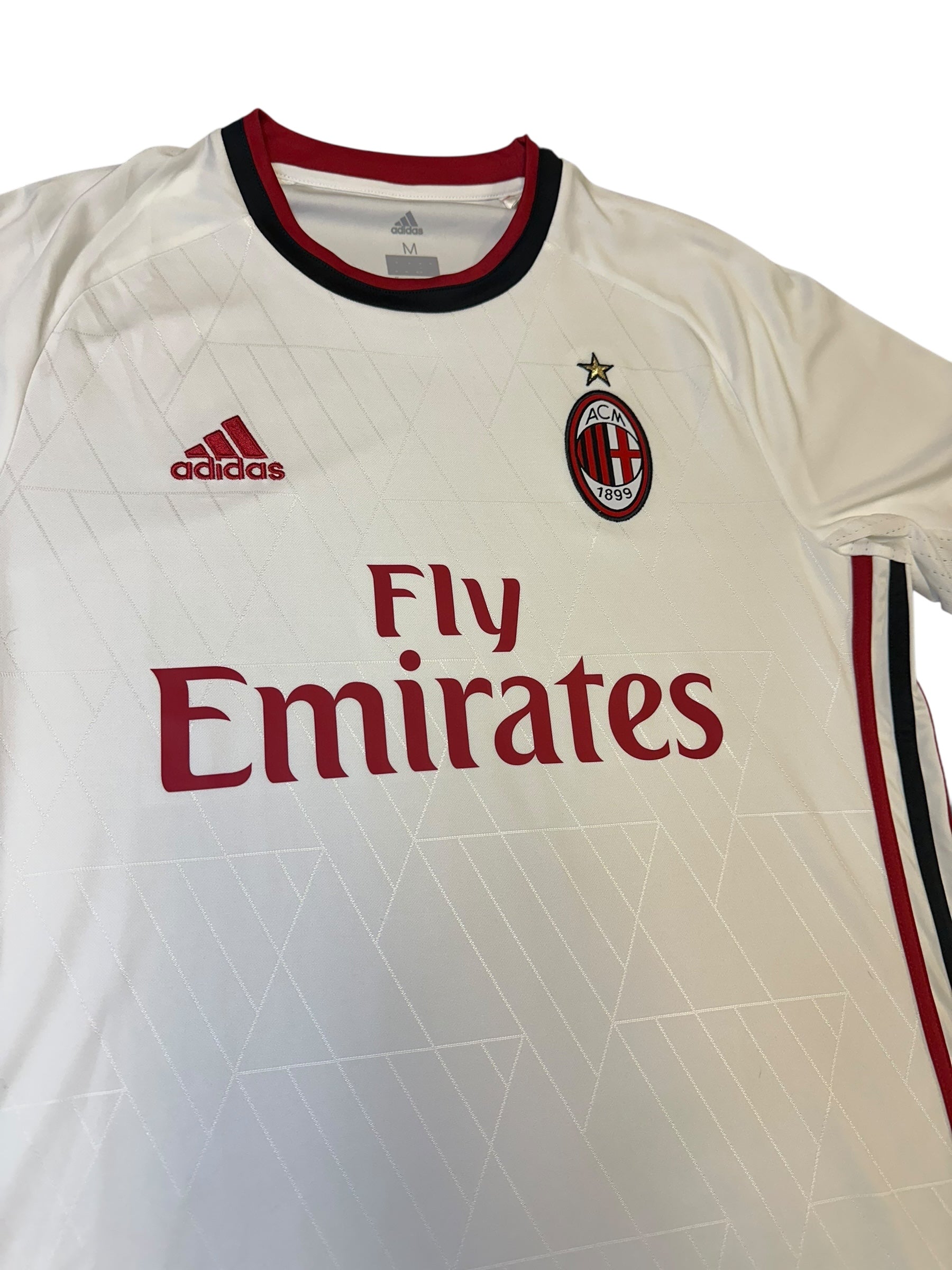 Clean white away kit from Adidas, worn during the 2017/18 Serie A season. Features deep red trim and Fly Emirates sponsor — a blend of modern simplicity and Milan tradition. Medium fit.