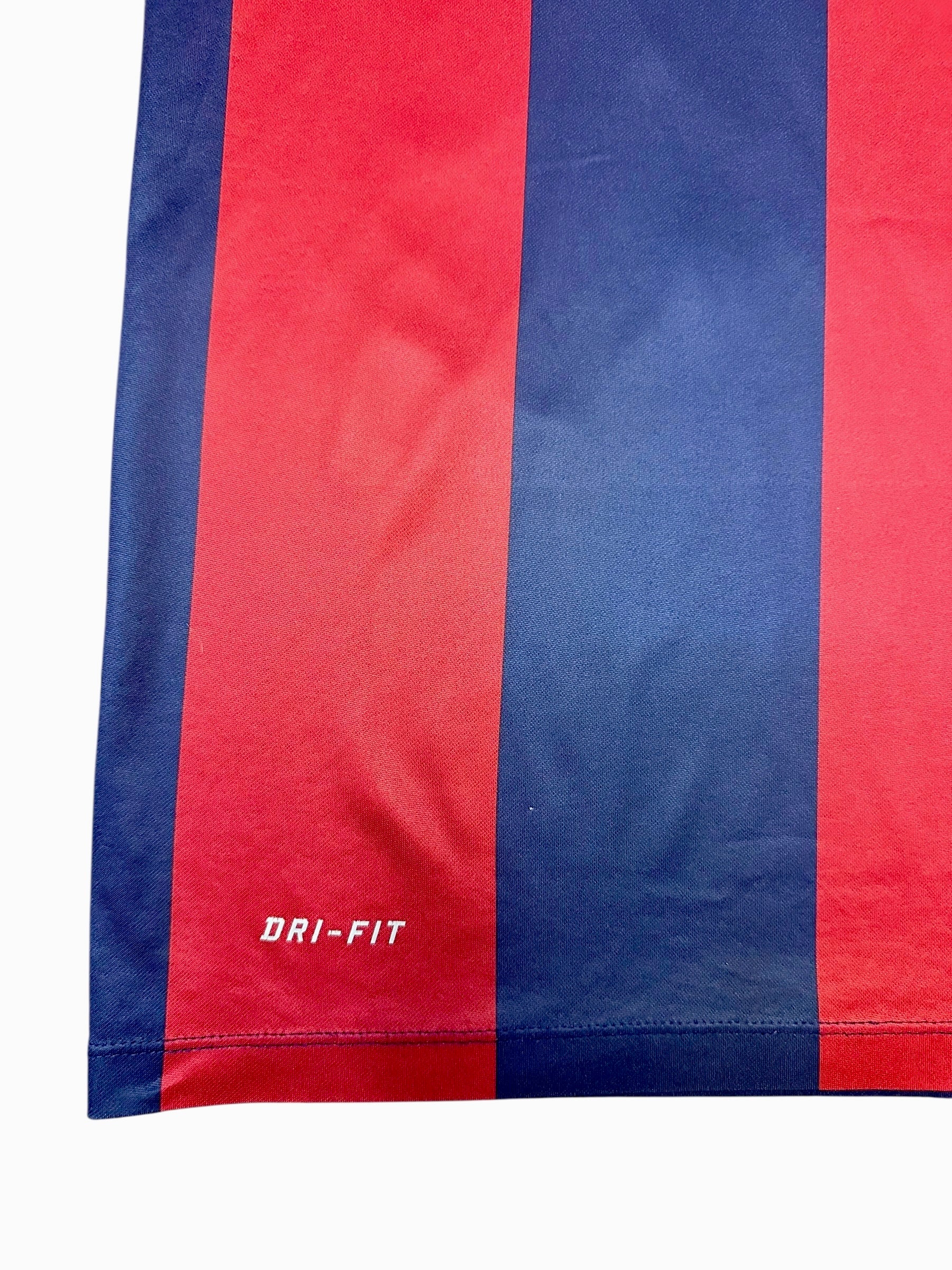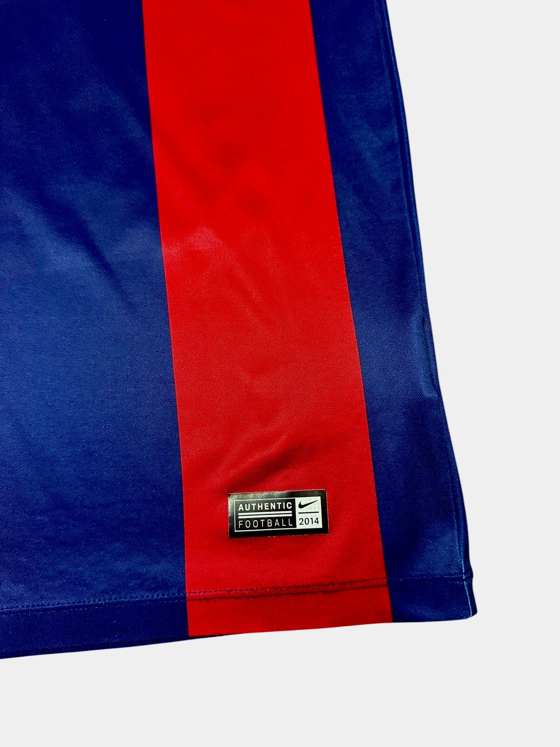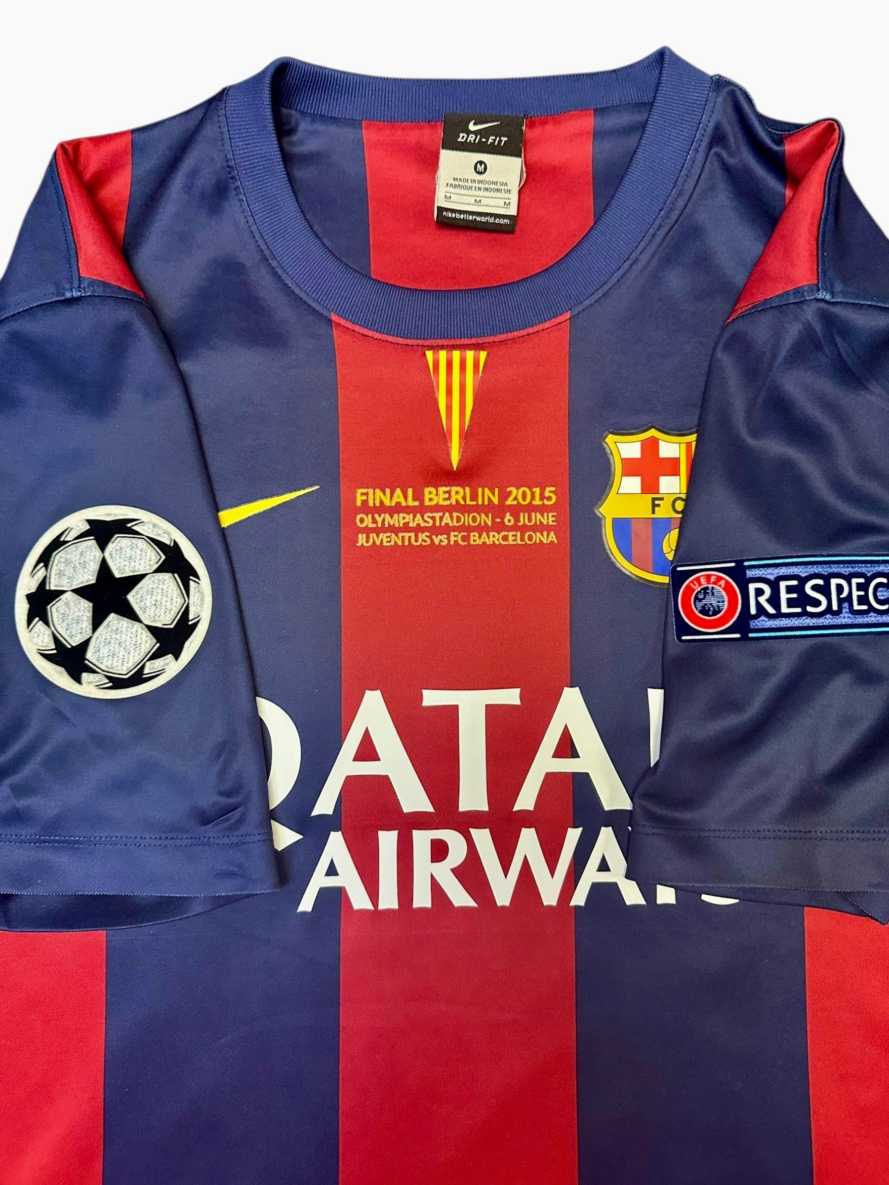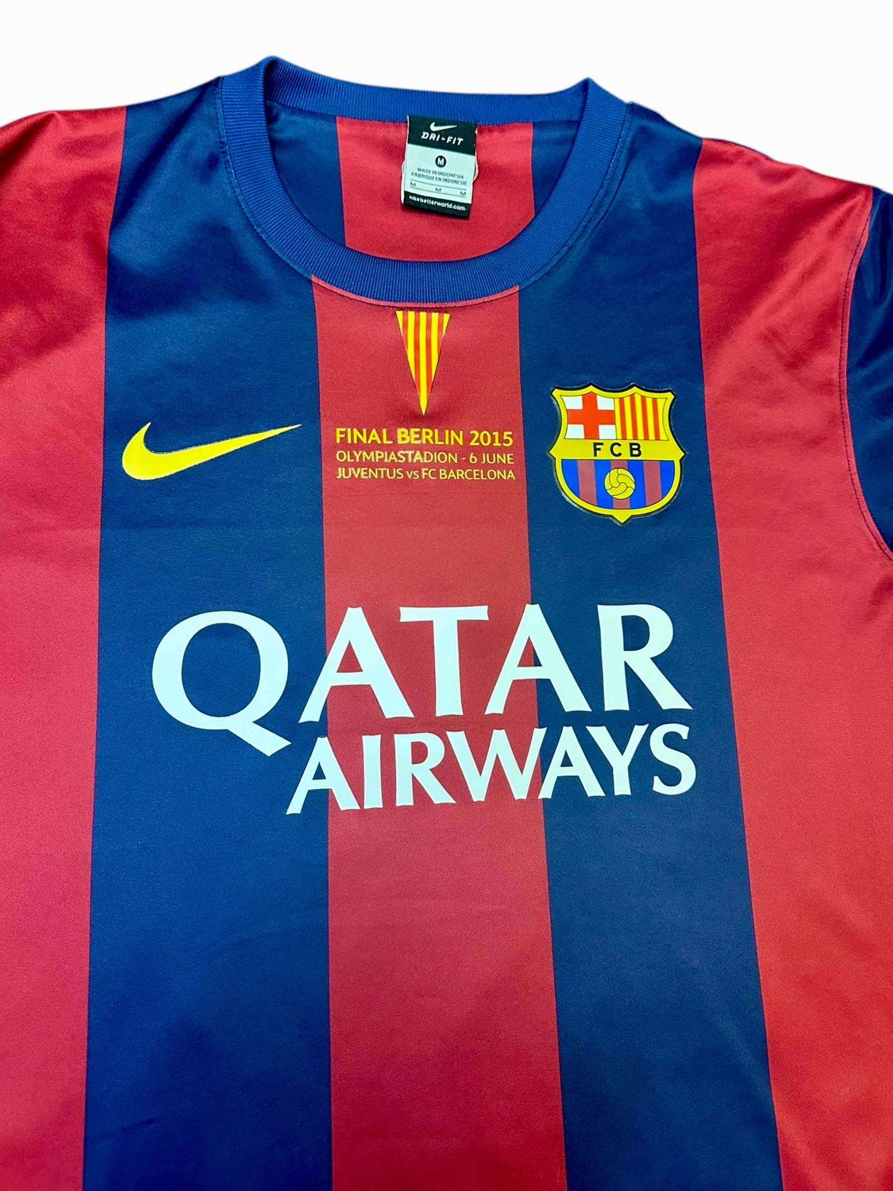 Traditional blaugrana stripes with blue collar — the 2014/15 home shirt worn by Messi during Barcelona’s treble-winning season under Luis Enrique. Medium fit with Messi’s #10 on the back. A legendary piece tied to one of Barça’s most dominant squads.